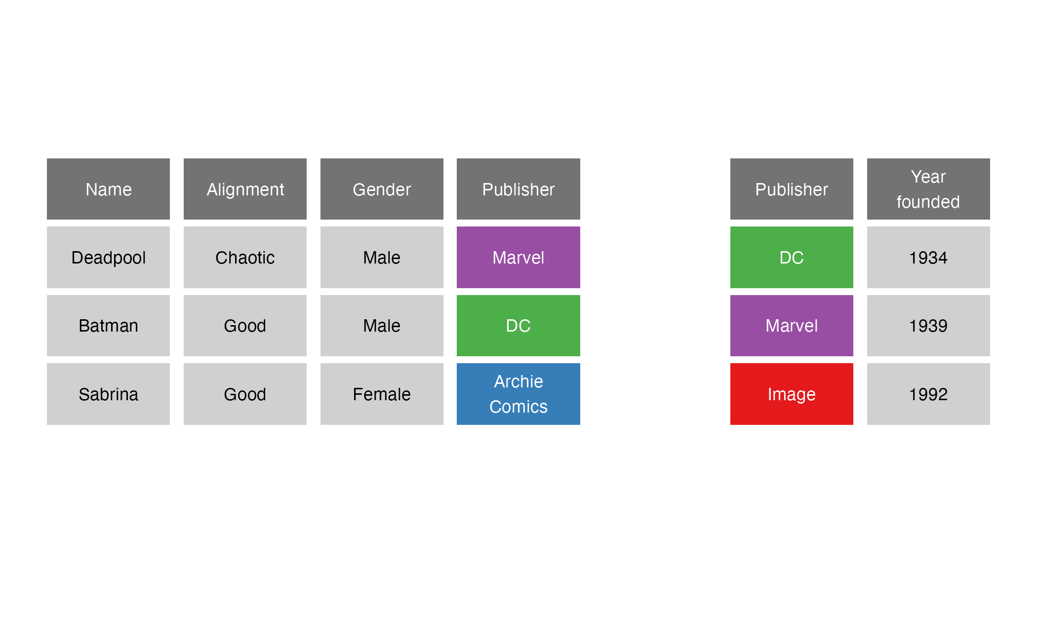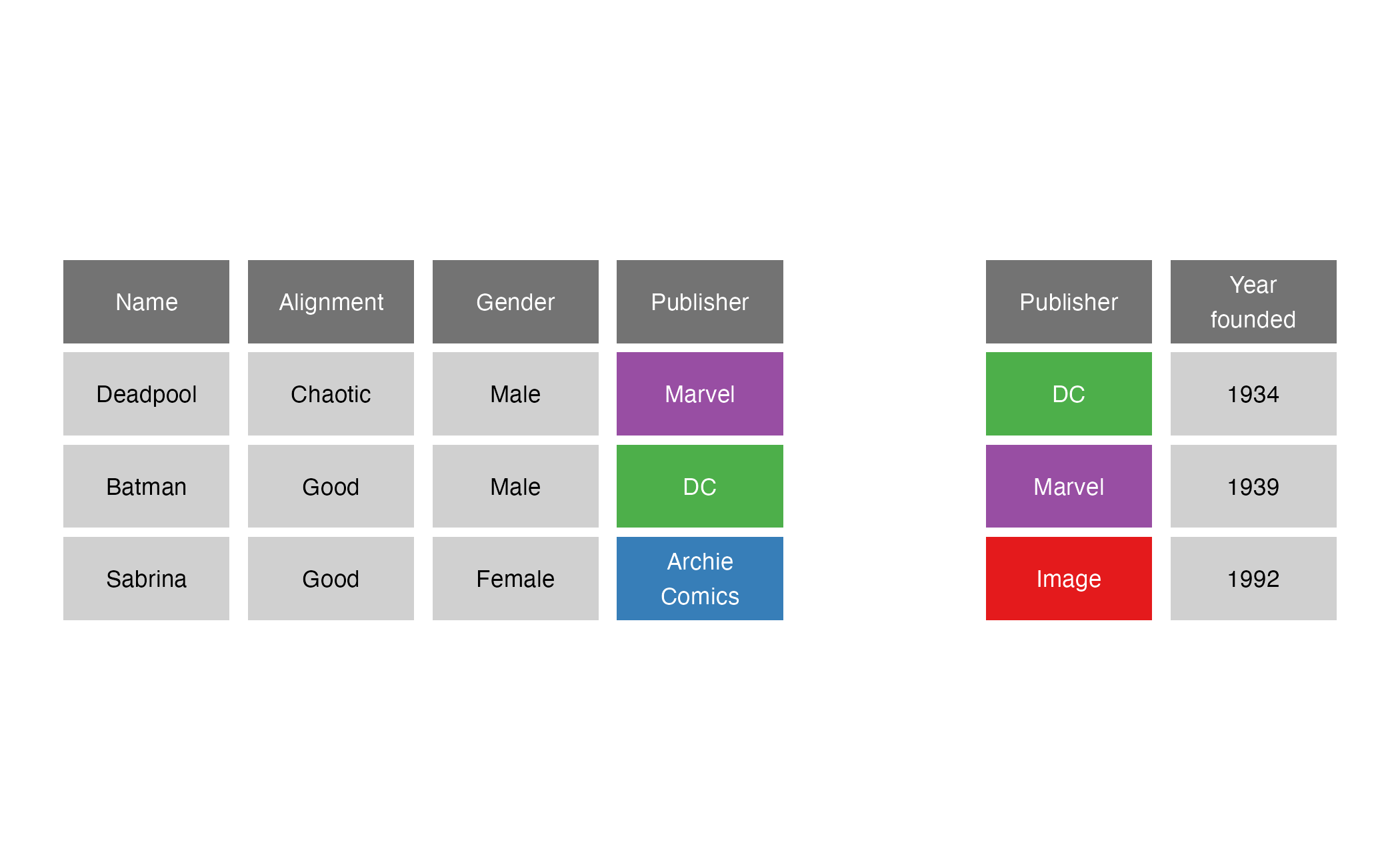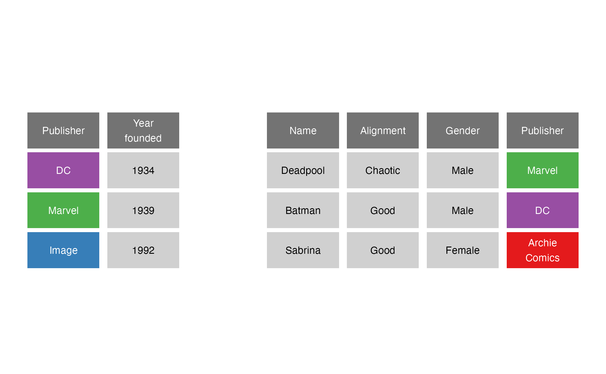 left_join()right_join()right_join(x = superheroes, y = publishers, by = join_by(Publisher))